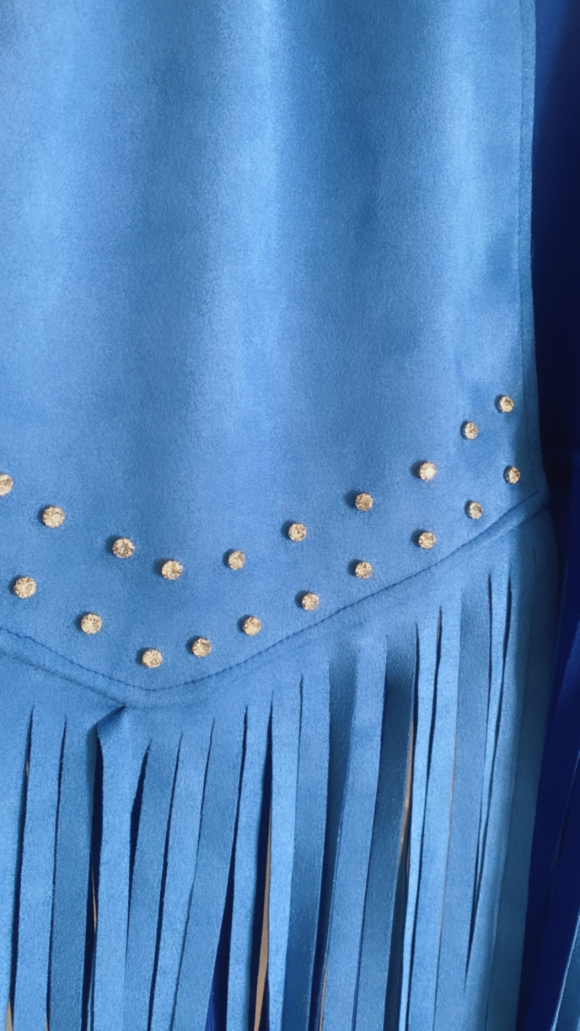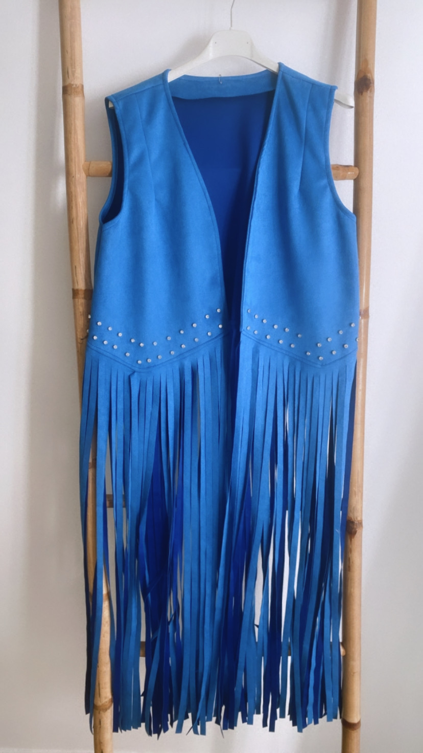 Una monada de chaleco con los flecos largos y en la parte de brillantes lleva brillantitos.