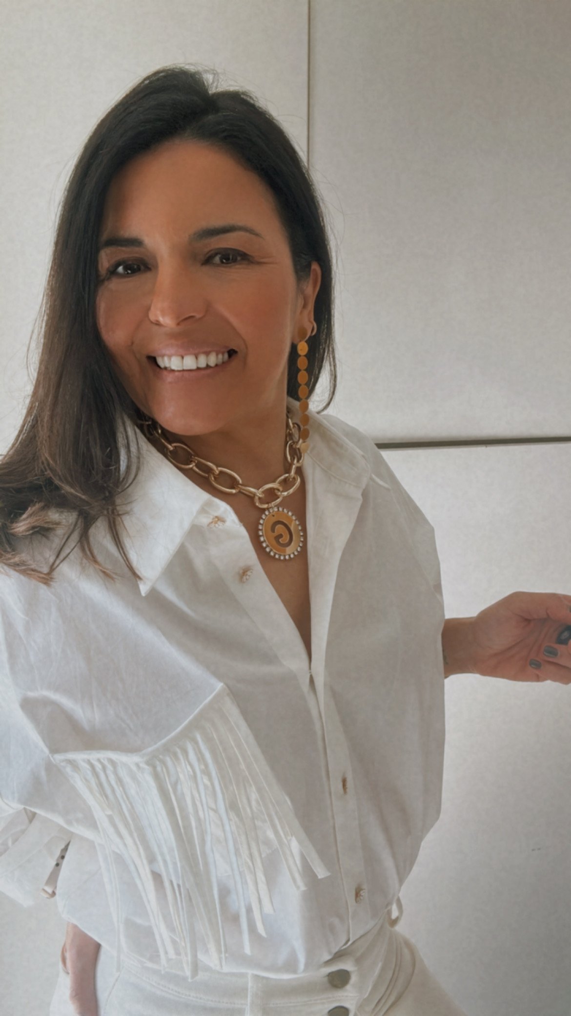 Una pieza elegante y personalizada. Su colgante circular con inicial recortada resalta sobre el fondo bicolor y está rodeado de irconitas que aportan luz y sostificación.