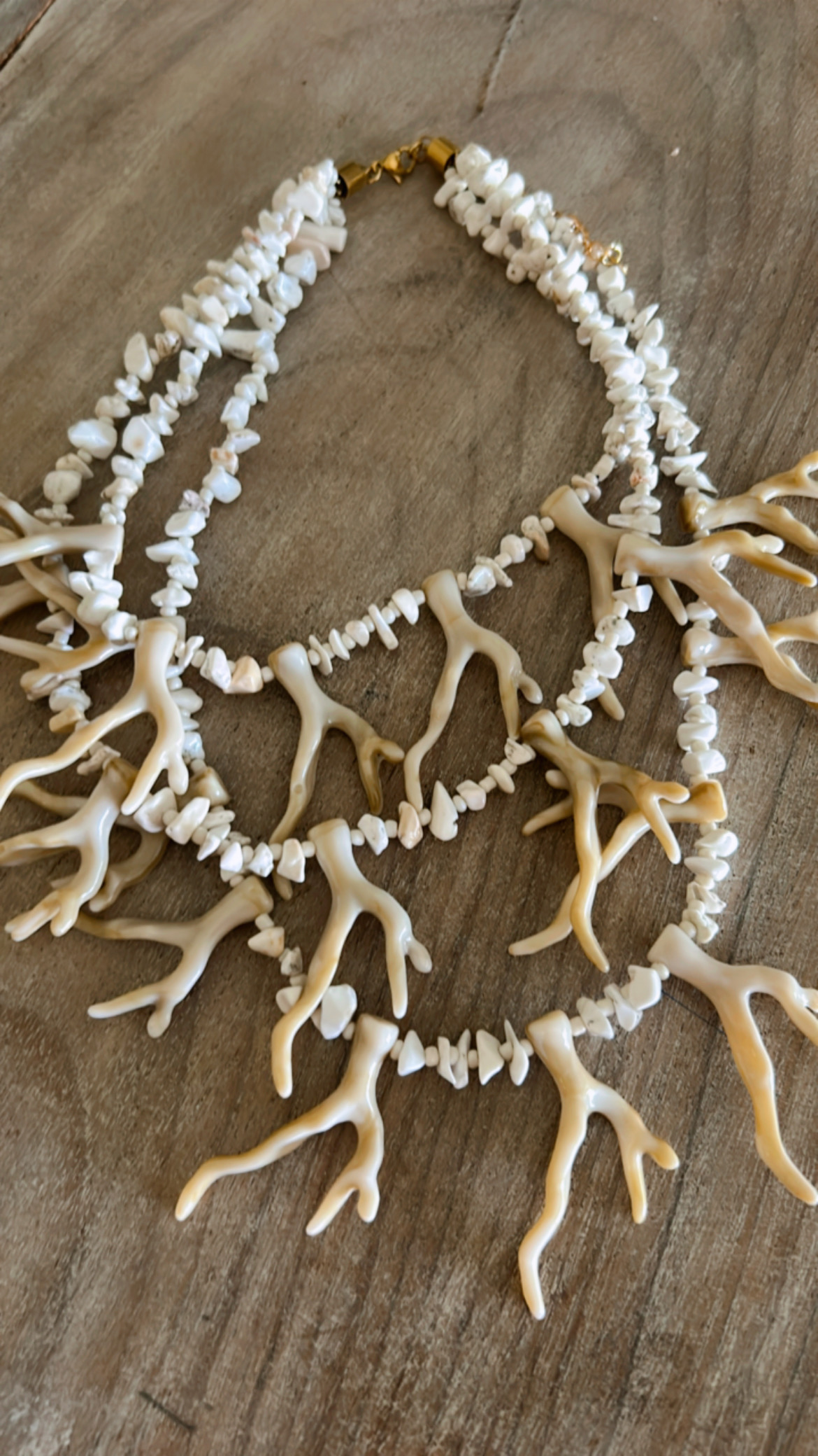 Inspirado en el encanto natural del Mediterráneo, el Collar Cannes es una pieza llamativa y sofisticada que no pasa desapercibida. Su diseño combina ramas de coral en tono marfil con pequeñas cuentas que evocan conchas marinas, creando un efecto visual fresco y muy veraniego.