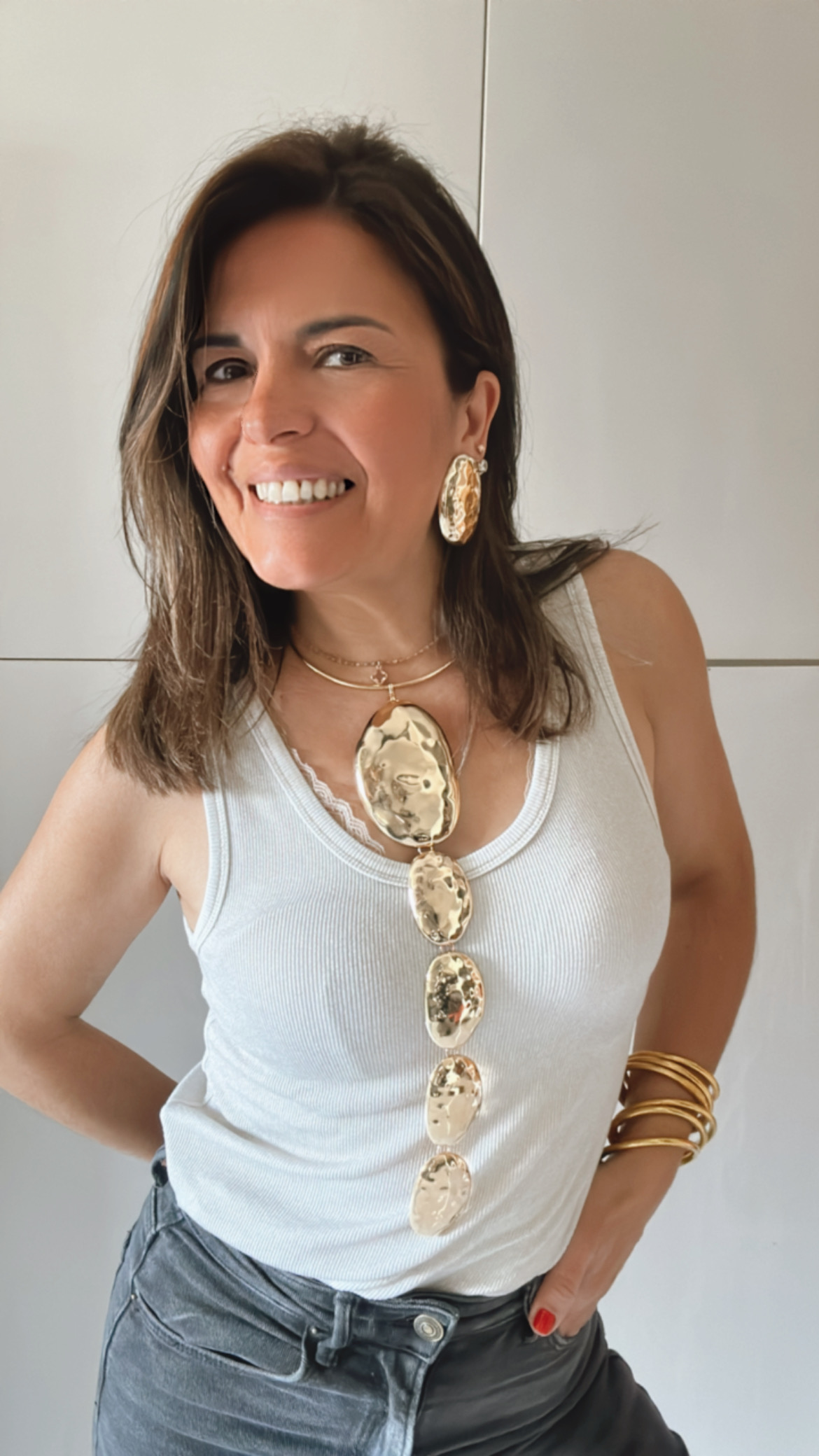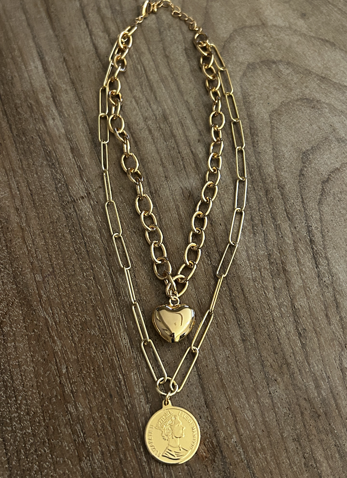 Una pieza elegante y doble. Doble collar uno mas corto con eslabones y corazón y el más largo eslabones largos con medalla.