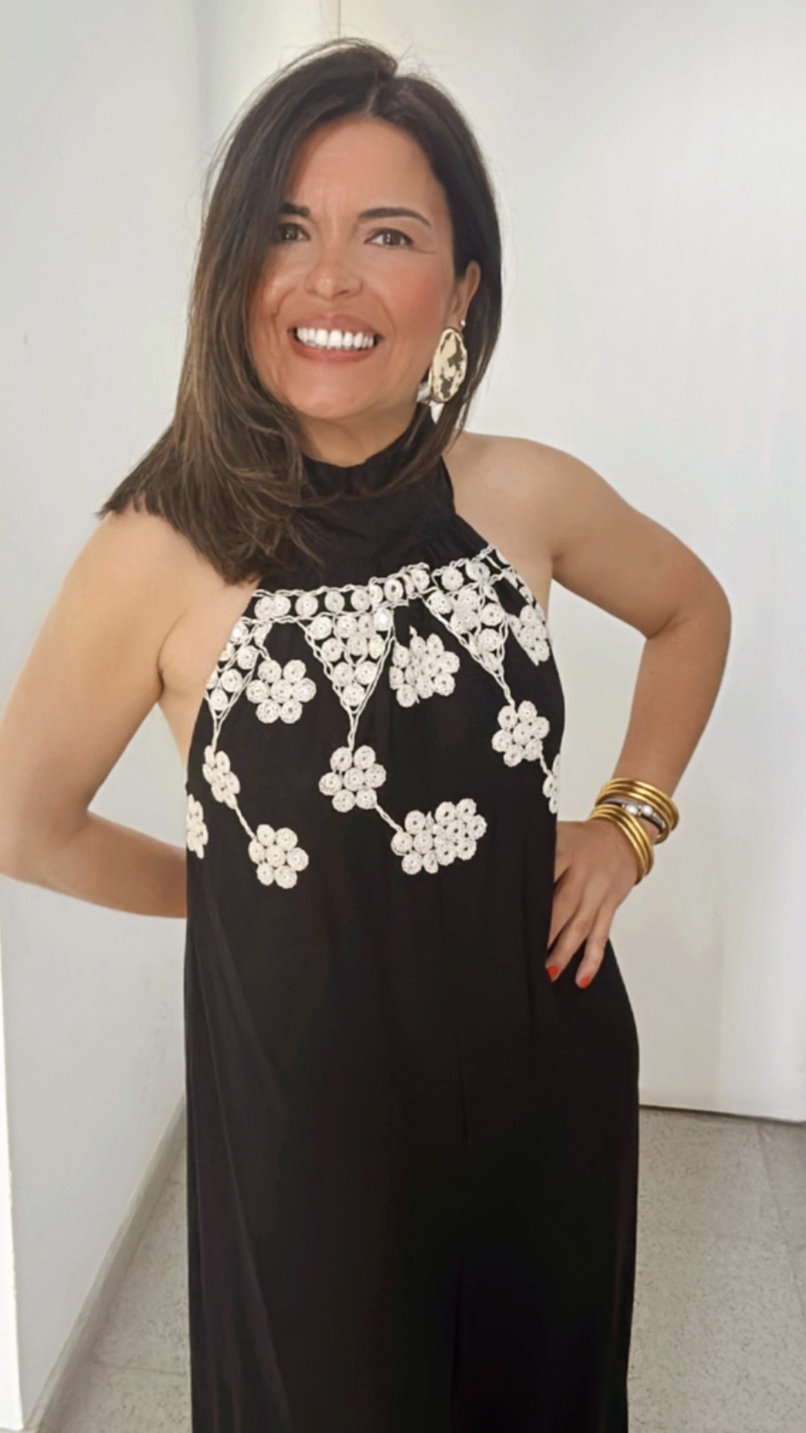 Su bordado en contraste blanco y negro en el cuerpo y en los bajos del pantalón le da un toque artesanal, delicado y muy favorecedor 🌸🖤 La pierna ancha aporta movimiento y una caída espectacular.