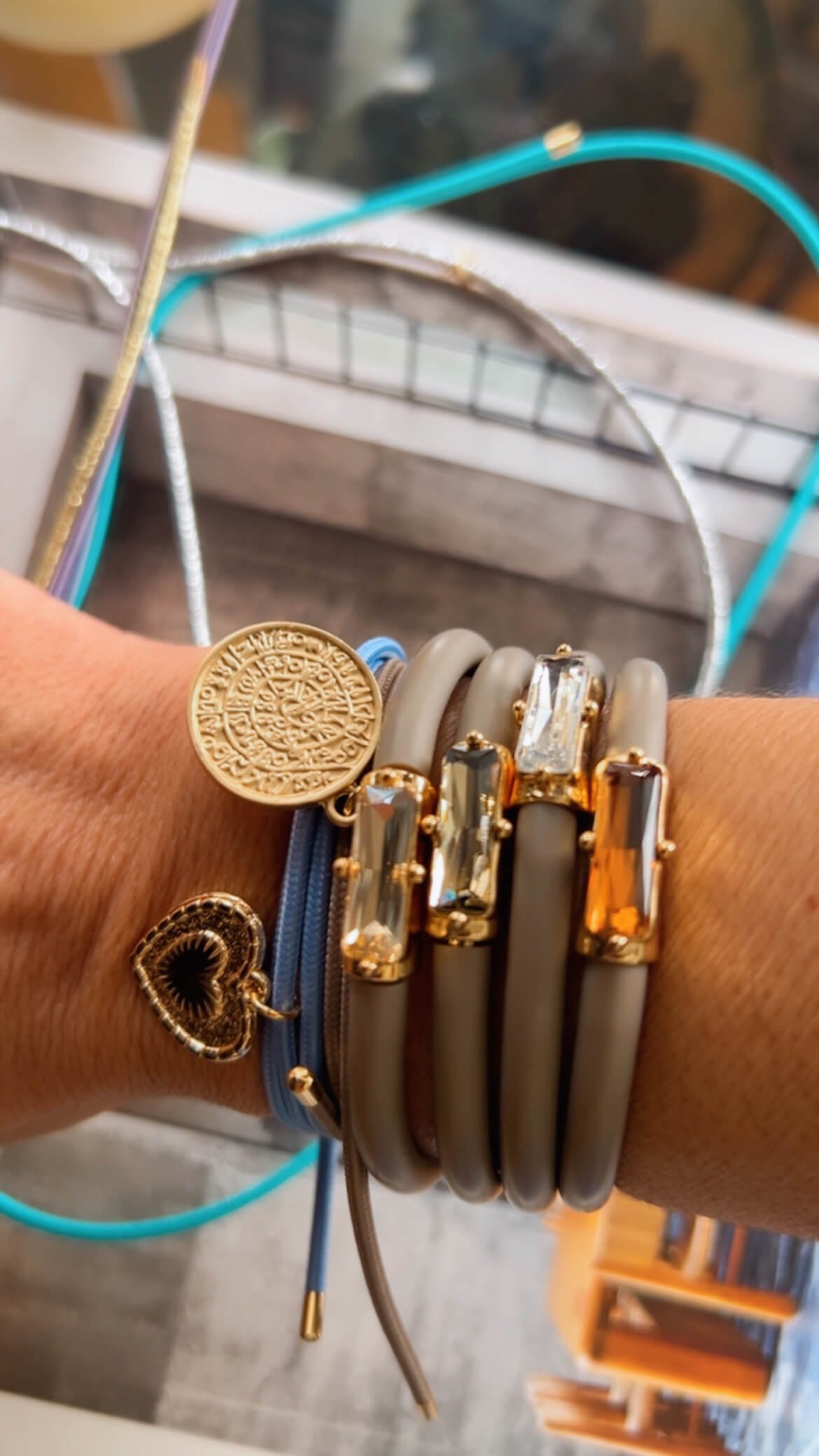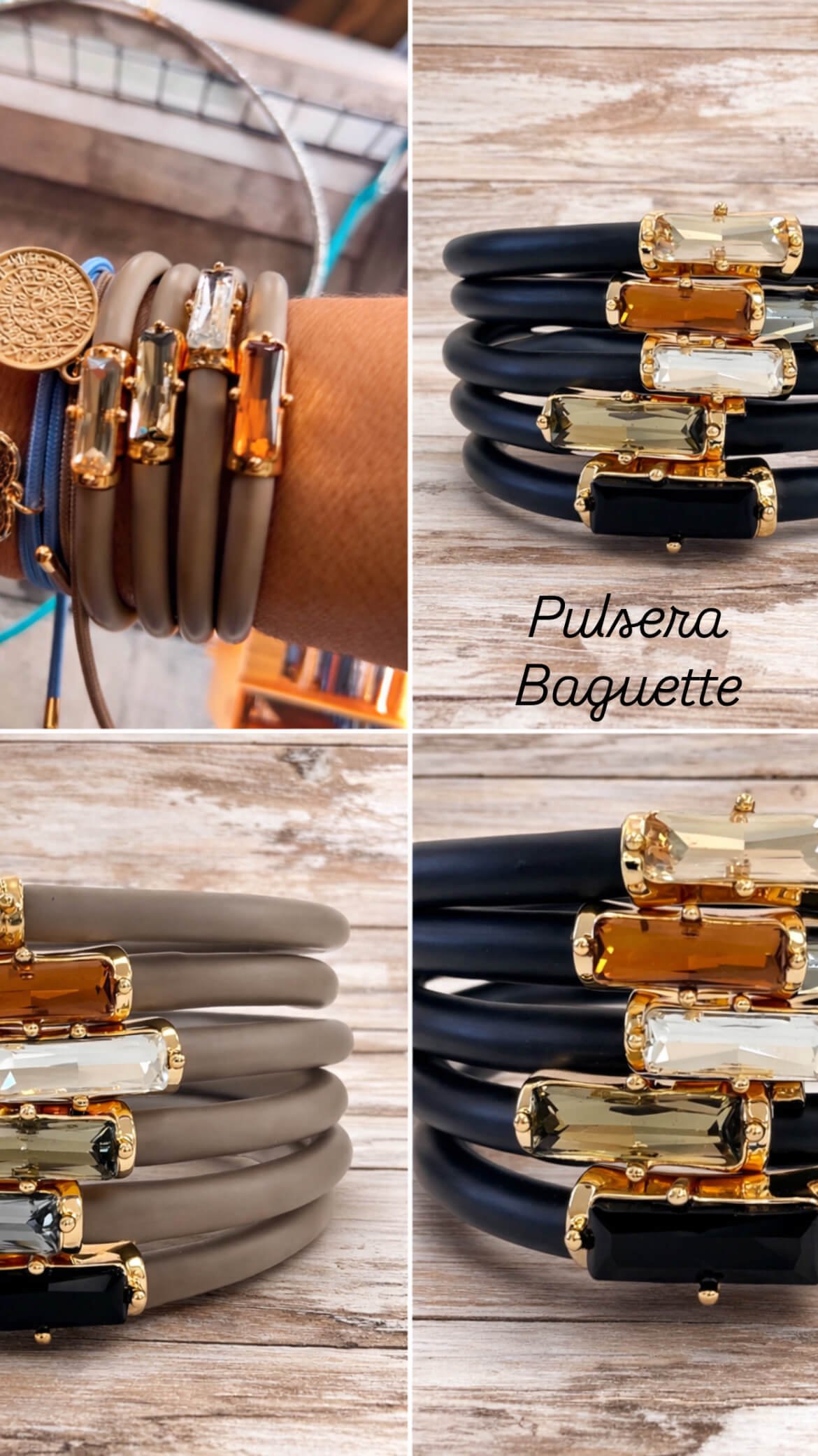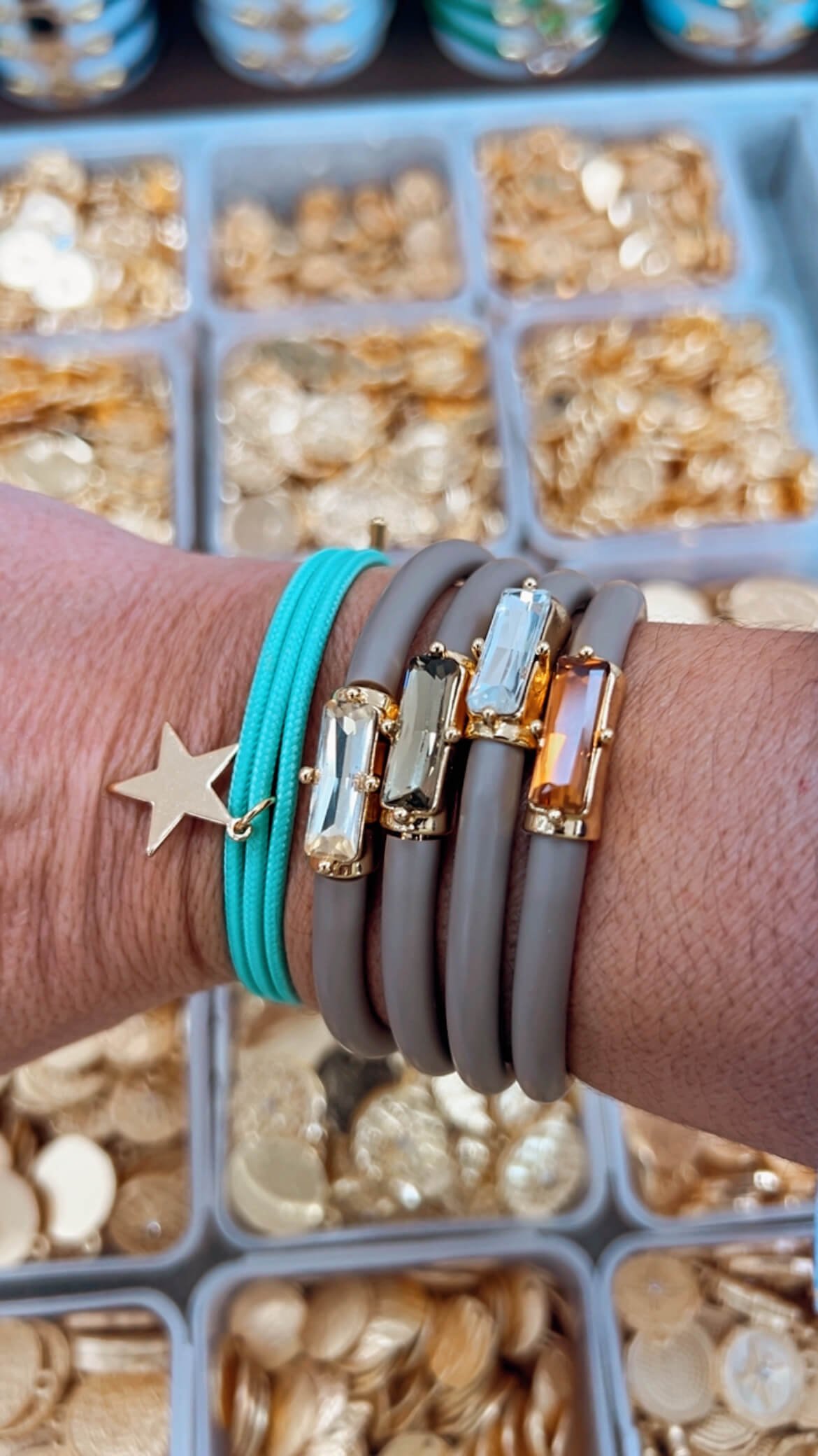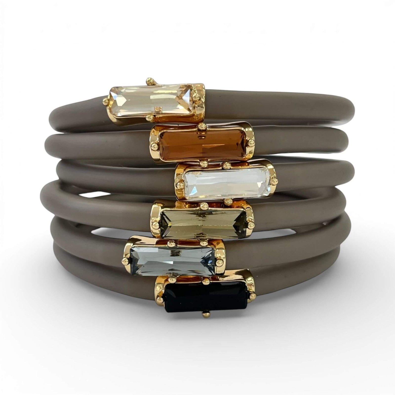 Pulsera en caucho color piedra, estructura en latón de alta calidad y piedra en cristal tallado, facetado.
