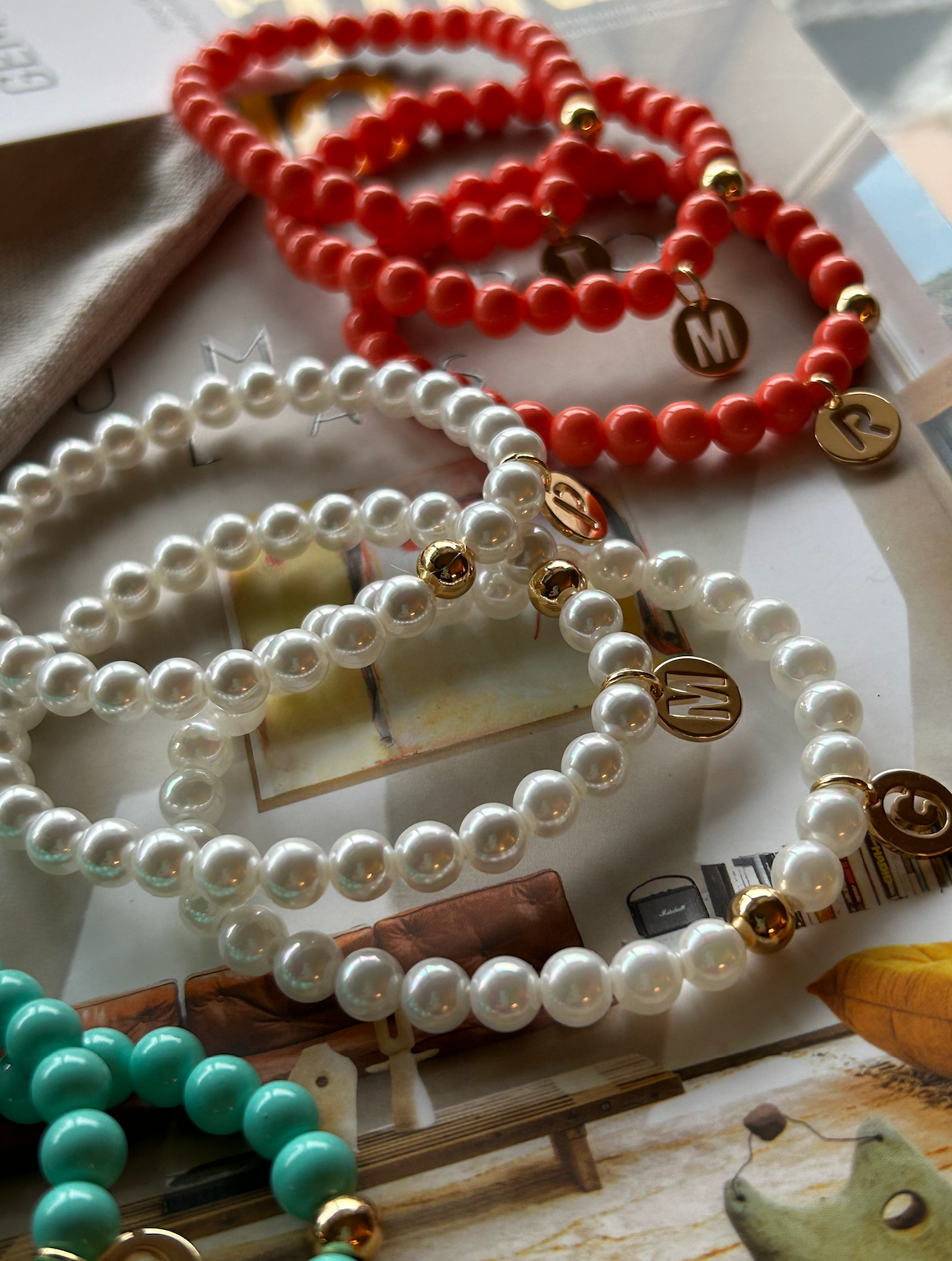 Material: bolas en perlas, turquesas o coral y acero en oro.